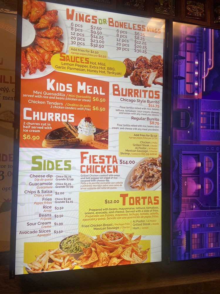 French fries topped with cheese dip (6 oz.) cilantro, onion and the meat of your choice. Carne de papas fritas cubiertos con su eleccidn de carne, rematadas con un dip de queso y cilantro, cebollas y crema.